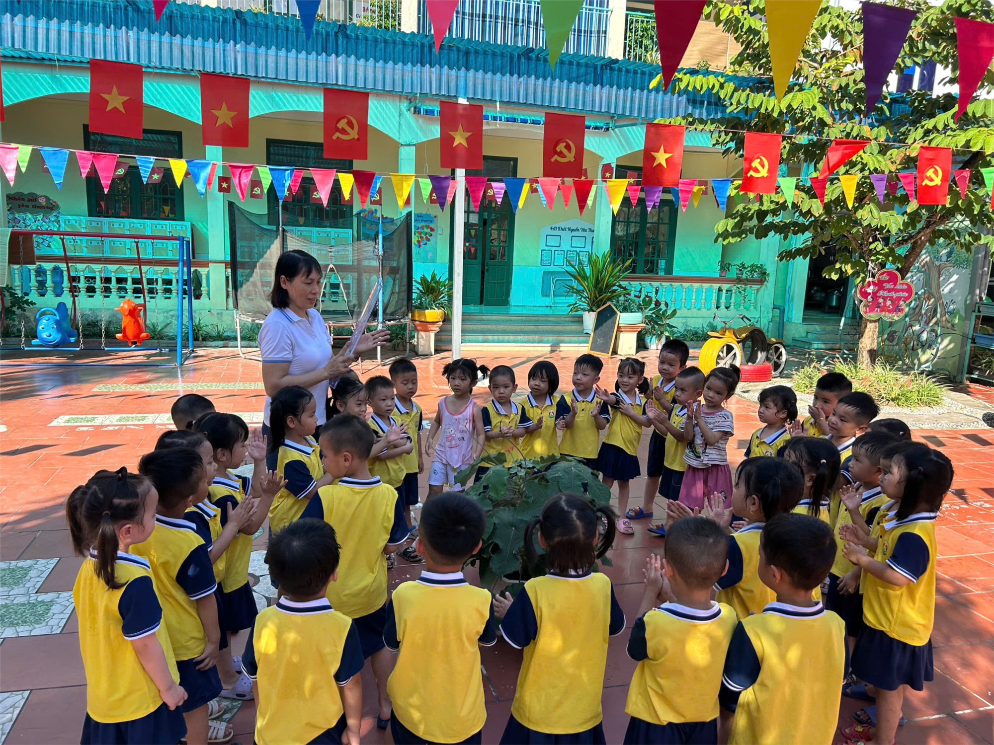 Trong mỗi buổi ra sân, các con được rèn nề nếp, kỷ luật khi xếp hàng ngay ngắn, biết chờ đến lượt mình. Các con có cơ hội quan sát cây hoa, cây xanh trong sân trường, từ đó hình thành tình yêu thiên nhiên, biết chăm sóc và bảo vệ môi trường xung quanh.
