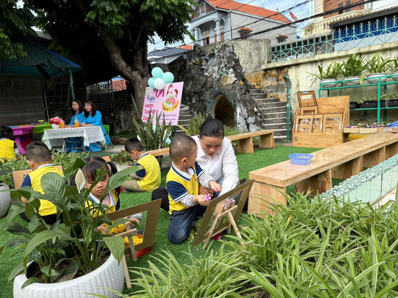 Hoạt động làm tranh hoa sáng tạo ngoài trời chào mừng ngày Nhà giáo Việt Nam 20/11 không chỉ là một trải nghiệm nghệ thuật đơn thuần, mà còn là cơ hội để trẻ 4-5 tuổi khám phá, học hỏi và bộc lộ cảm xúc theo cách tự nhiên nhất. Khi được hòa mình vào không gian thiên nhiên, trẻ trở nên thoải mái, cởi mở và giàu cảm hứng sáng tạo hơn. Mỗi chiếc lá, mỗi bông hoa, mỗi cành cây khô như một chất liệu kỳ diệu giúp trẻ thể hiện trí tưởng tượng phong phú của mình.