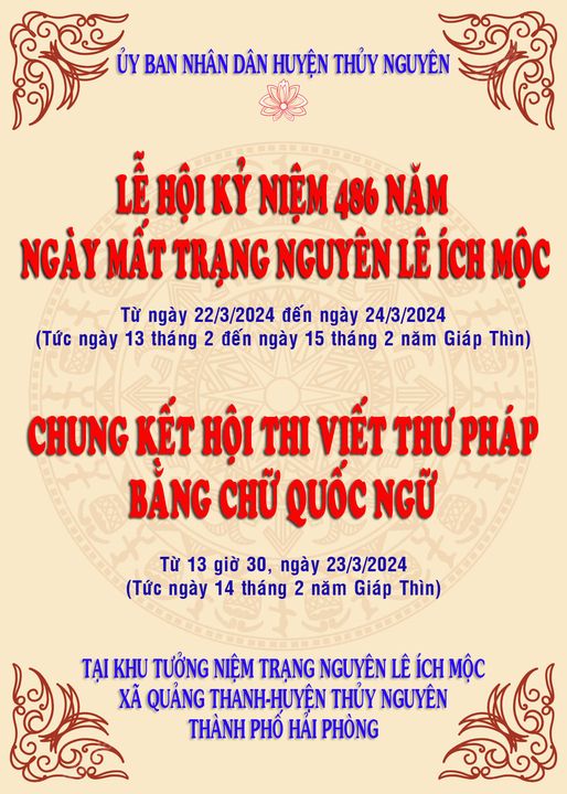 Trân trọng kính mời các thầy cô giáo, các bậc phụ huynh, các em học sinh và toàn thể nhân dân tham dự Lễ hội kỷ niệm 486 năm ngày mất Trạng nguyên Lê Ích Mộc - Chung kết hội thi viết thư pháp bằng chữ Quốc ngữ năm 2024!Trân trọng kính mời các thầy cô giáo, các bậc phụ huynh, các em học sinh và toàn thể nhân dân tham dự Lễ hội kỷ niệm 486 năm ngày mất Trạng nguyên Lê Ích Mộc - Chung kết hội thi viết thư pháp bằng chữ Quốc ngữ năm 2024!