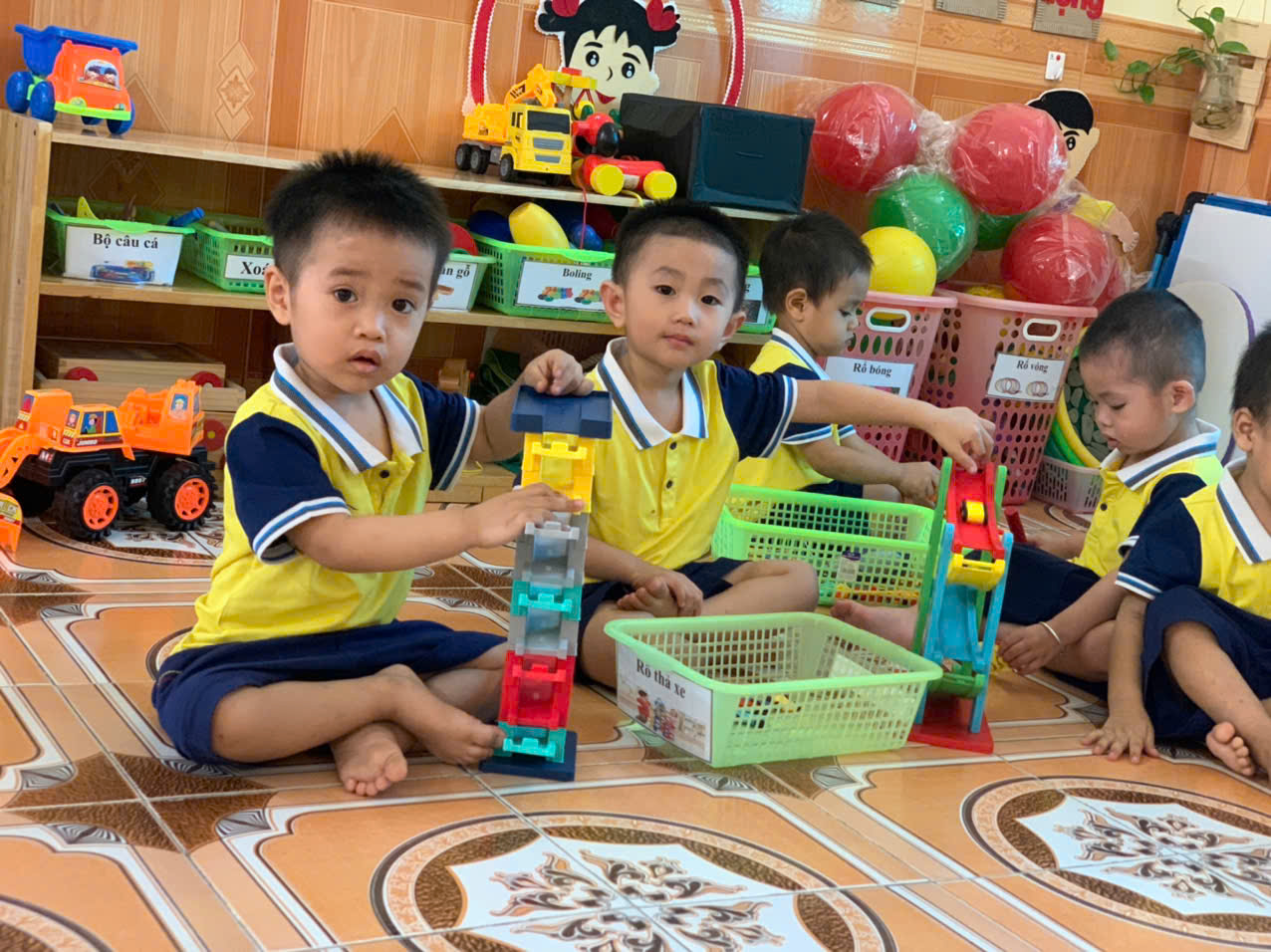 Với độ tuổi 24- 36 tháng, trẻ tham gia vào 4 khu vực chơi ở lớp như: Khu vực chơi thao tác vai (trẻ bắt chước giả bộ các trò chơi: Nấu ăn, bế em,cho em ăn, ru em ngủ…).Khu vực vận động (trẻ chơi kéo xe, thả bóng-bi, câu cá, tung bóng, lồng hộp, búa bi, búa cọc…).. Khu vực nghệ thuật ( Xem tranh ảnh, kể chuyện bằng rối, tô màu, nặn…). Khu vực hoạt động với đồ vật ( trẻ chơi tìm bóng, phân biệt màu, phân biệt to-nhỏ…)Ở mỗi khu vực chơi trẻ được học những kiến thức, kỹ năng khác nhau và quan trọng hơn cả là trẻ có cơ hội được thể hiện mình và biết phối hợp cùng bạn khi tham gia các hoạt động.